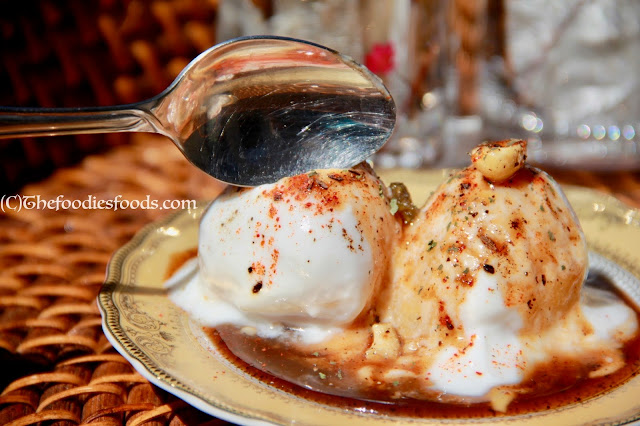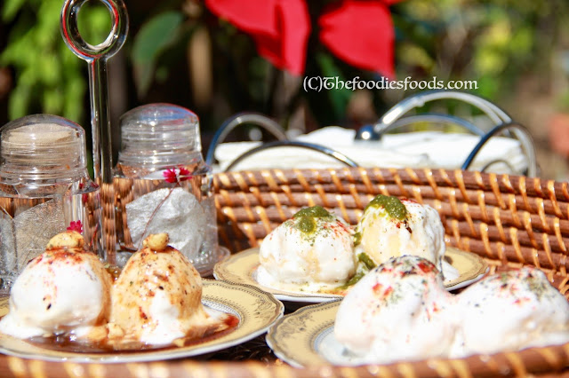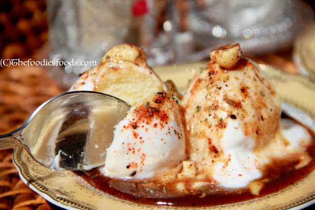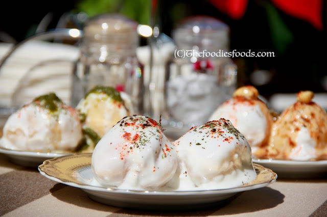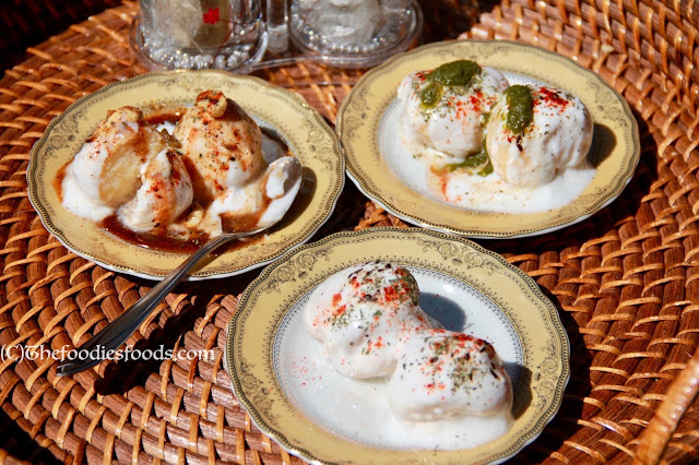 Squeeze them out and pour the creamy yoghurt on it. They can now be served with Sonth chutney, Green Coriander-Mint Chutney, dry mint powder, red pepper powder, cumin powder, and Salt.